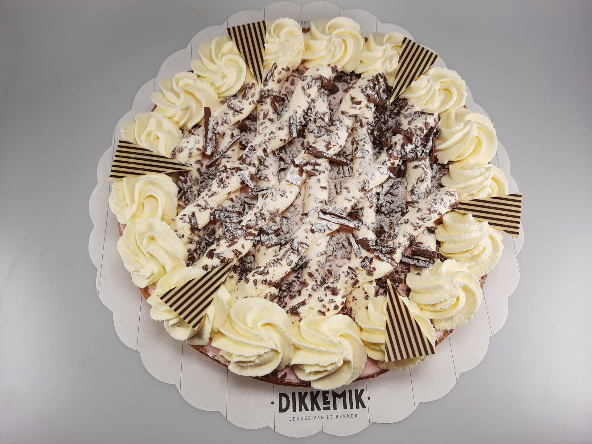 Vlaaideegbodem met kersen, kersenbavarois, slagroom, chocolade en poedersuiker