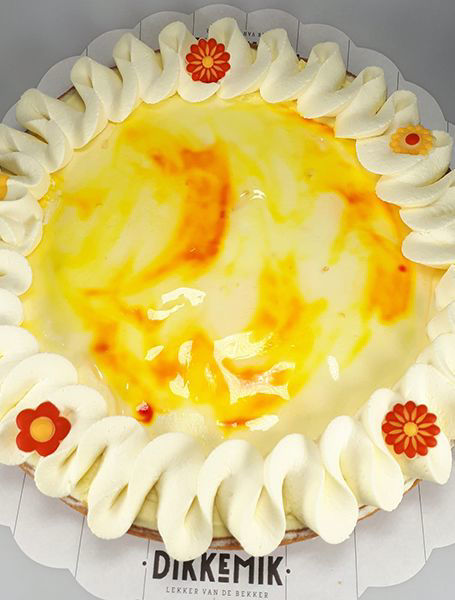 Heerlijke vlaai op een half harde wenerbodem met een zachte mango-abrikoos vulling en mango-abrikozen bavarois, afgewerkt met aan rand slagroom en een lente-achtige decoratie.
