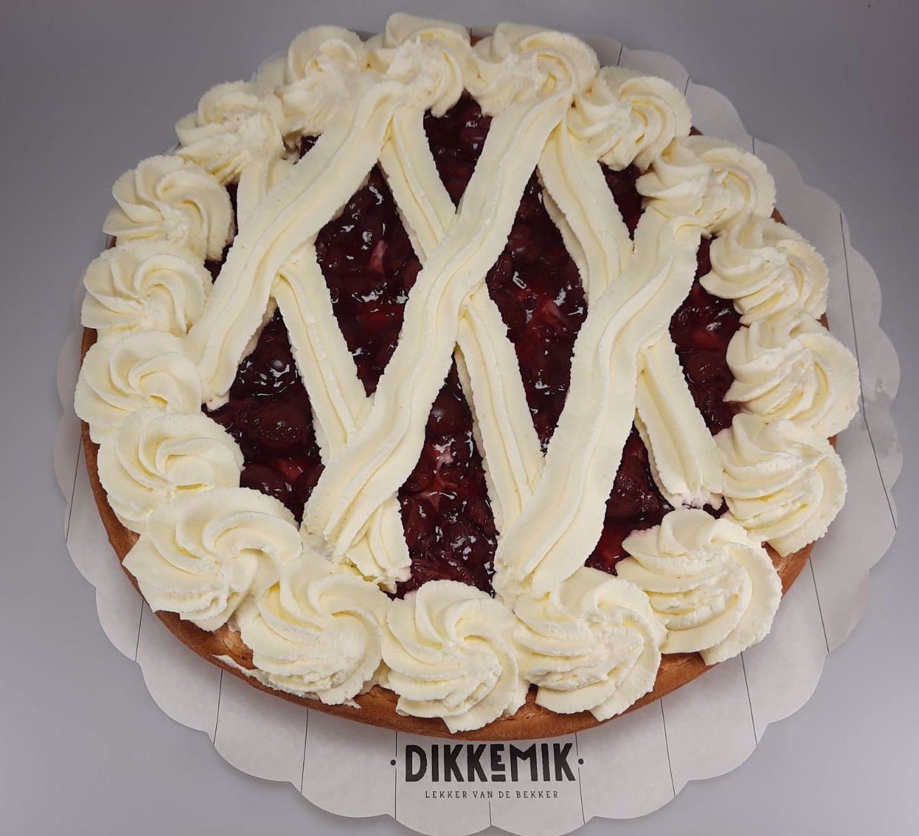 Rijstevlaai met een laag kersen erop, afgewerkt met slagroom let op deze actie is alleen vrijdag en zaterdag verkrijgbaar